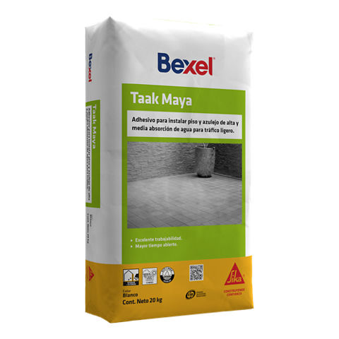 Bexel® Taak Maya® es un adhesivo excelente para la instalación de revestimientos de alta y media absorción de agua en interiores solamente, ya sea en muros y pisos con tráfico ligero. Sus componentes, cemento Portland, agregados inertes clasificados y aditivos químicos especiales, le imparten el tiempo abierto, la trabajabilidad y la adhesión adecuadas para hacer buenas instalaciones de revestimientos.