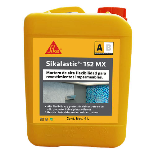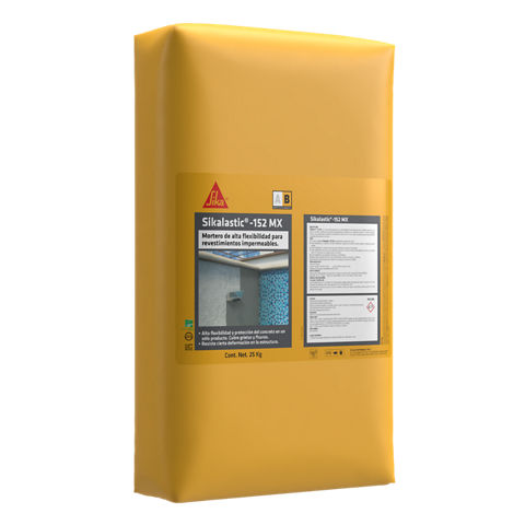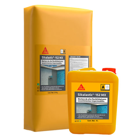 Sikalastic®-152 MX es un mortero bicomponente y de alta flexibilidad, reforzado con fibras y aditivos especiales, con base en cemento modificado con polímeros especialmente resistentes a los ambientes alcalinos. Contiene agregados inertes con granulometría controlada con diámetros máximos de 0.5 mm y aditivos específicos para impermeabilizar y proteger estructuras de concreto.