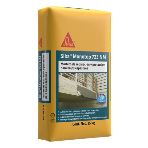 Sika MonoTop®-723 NM Es un mortero de reparación de un solo componente, base cemento modificado con polímeros, de alto rendimiento, listo para usar en aplicaciones de bajo espesor como nivelación, acabado y protección anticorrosiva de barras de acero.