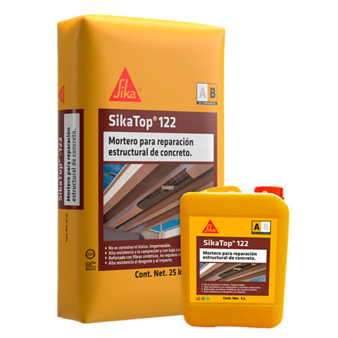 SikaTop®-122 es un mortero de 2 componentes, base cemento modificado con polímeros, adicionado con fibras sintéticas, de alto desempeño, con gran adherencia a superficies horizontales, verticales y sobre cabeza, especialmente diseñado para la reparación en elementos estructurales de concreto.