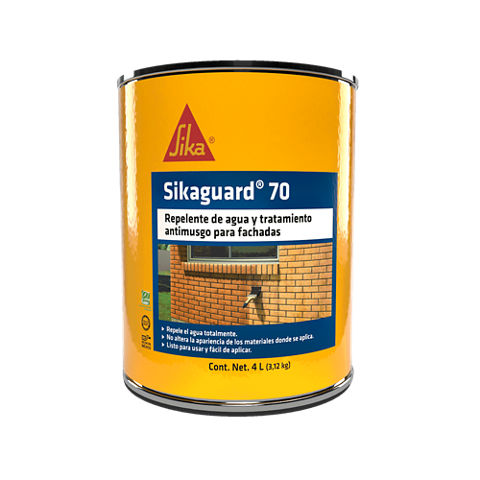 Sikaguard-70 es una impermeabilización incolora basada en resina de silicona transportada en solvente, ofrece protección impermeable contra la penetración del agua de lluvia en fachadas o estructuras porosas expuestas a la intemperie, sin cambiar el aspecto original de las superficies.